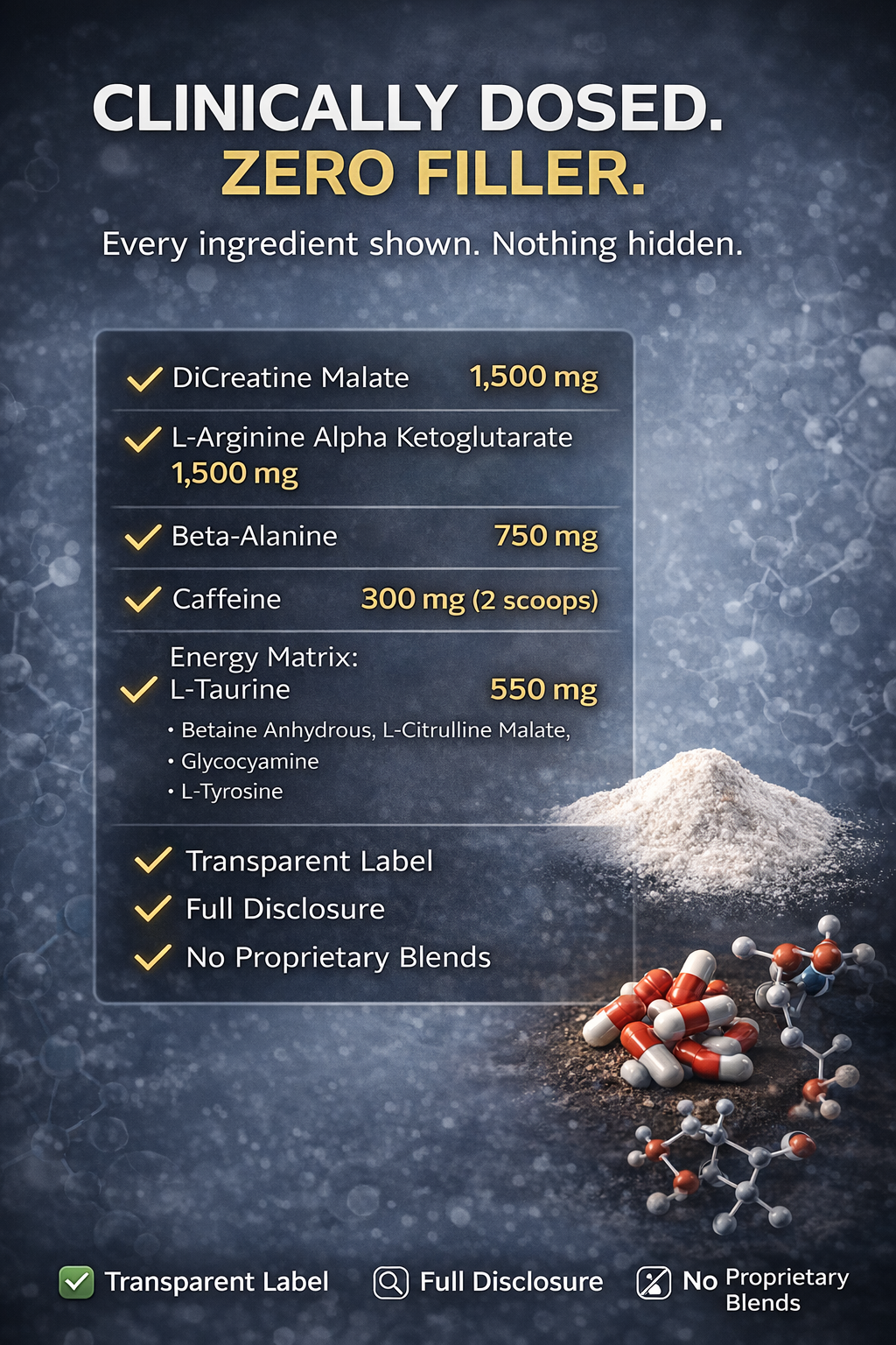 L-Tyrosine, L-Theanine, Choline Bitartrate, and Caffeine work together to sharpen reaction time, heighten concentration, and put your mind into full tactical mode. This blend hits fast, keeps you locked, and makes distractions disappear.